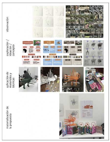 Por su parte, el taller de Volúmenes se enfoca en la elaboración de un animal fantástico, dando énfasis en lo táctil, incluyendo un fanzine, y se suman elementos pictográficos, además de integrar conocimiento de los volúmenes G0, G1 y G2, como se muestra en la figura 8. Explica Andrea: “Aprendí cosas que no sabía hacer, como cambiar figuras orgánicas a geométricas, distinguir diferentes tipos de pictogramas y sus propósitos, hacer un dibujo en perspectiva usando puntos de fuga.” (Garza, 2023, p. 20).