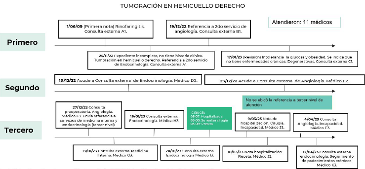 Lo primero observado es que, aunque había 11 notas, la historia clínica no estaba completa. La mayoría de las notas se generaron para describir los pasos preoperatorios y posoperatorios, por lo tanto, hay solicitudes de laboratorios, incapacidades y la aprobación del estado de salud entre los servicios para realizar la cirugía, específicamente de Endocrinología, Angiología, Cirugía y Medicina Interna. Hay un diagnóstico preciso: tumor benigno del cuerpo carotídeo. Queda claro que Romina acudió previamente a un médico particular y el diagnóstico y laboratorios le permitieron llegar al tercer nivel de atención. Los estudios de laboratorio también los hizo por medios privados. Además, se señala que tiene prediabetes —enfermedad que en teoría tendría que ser atendida en primer nivel— pero no encontramos registro en los expedientes de dicho nivel y sólo se registra: “Mujer de 39 años de edad enviada de primera vez de primer nivel por nódulos tiroideos detectado por médico internista particular, prediabetes” [Nota de EE, Romina, 15/12/22].