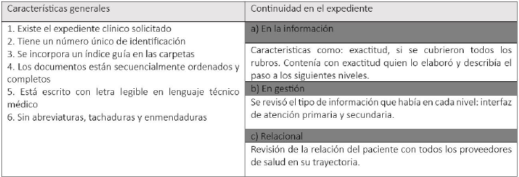 Para el análisis de los expedientes, la revisión comenzó por el primer nivel de atención y de manera consecutiva hasta llegar al tercero; se elaboró una guía de observación que incluía la descripción de la situación, las interacciones, la infraestructura, los tiempos, los marcos de referencia y el análisis del expediente físico o electrónico (véase tabla 1).