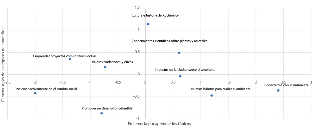 En la dimensión horizontal, preferencia por aprender los tópicos, se puede apreciar el orden leyendo de derecha a izquierda. En la primera mitad podemos ver los tópicos más preferidos, y fue el contacto con la naturaleza el tópico seleccionado con mayor frecuencia, como aquel que más les gustaría aprender. Le siguen nuevos hábitos para cuidar el ambiente, conocer los impactos que tiene la ciudad en el ambiente, conocimientos científicos sobre plantas y animales y la cultura e historia de Xochimilco.