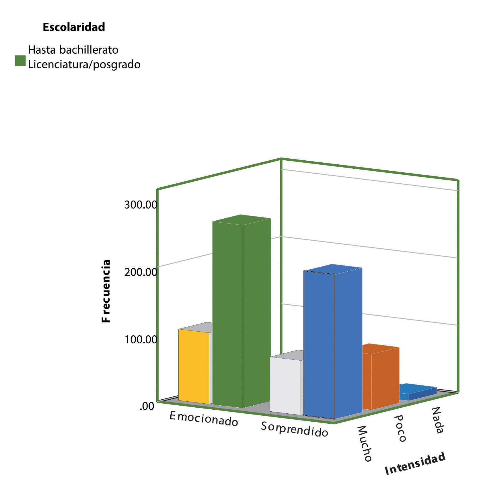En el componente afectivo se analizaron las respuestas a qué tan sorprendidos y emocionados se sintieron los visitantes en el parque. La mayoría de los visitantes reportó haberse sentido muy emocionado (88.5%) y sorprendido (69.3%) (Figura 2). La frecuencia en la que se experimentaron estas emociones fue distinta respecto a la escolaridad. Los visitantes con licenciatura o posgrado reportaron, con mayor frecuencia, sentirse más emocionados y sorprendidos que los visitantes con escolaridad hasta bachillerato (χ 2 = 8.63, p. = 0-01).