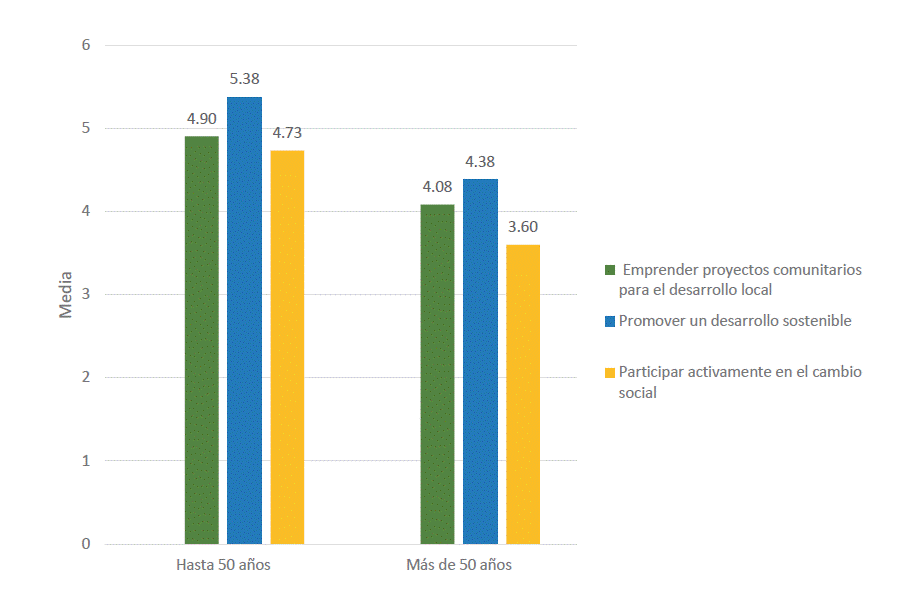 Un desafío mayor es lograr que los participantes se interesen en acciones más globales y abstractas, que no dependen únicamente de las intenciones individuales, como el desarrollo sostenible o el emprender proyectos comunitarios para el desarrollo local. Una posibilidad es considerar las características de los visitantes. Un resultado interesante al respecto es que el grupo de visitantes mayores (más de 50 años) mostró mayor preferencia por emprender proyectos comunitarios (F = 6.013, p. =0.01), promover desarrollo sustentable (F = 8.462, p. = 0.00) y participar activamente en el cambio social (F = 9.40, p. = 0.00), que el grupo más joven (hasta 29 años), tal como se muestra en la Figura 3. Se podrían diseñar estrategias orientadas hacia los grupos de edad, de tal manera que cada uno pueda obtener los aprendizajes que le sean más afines.