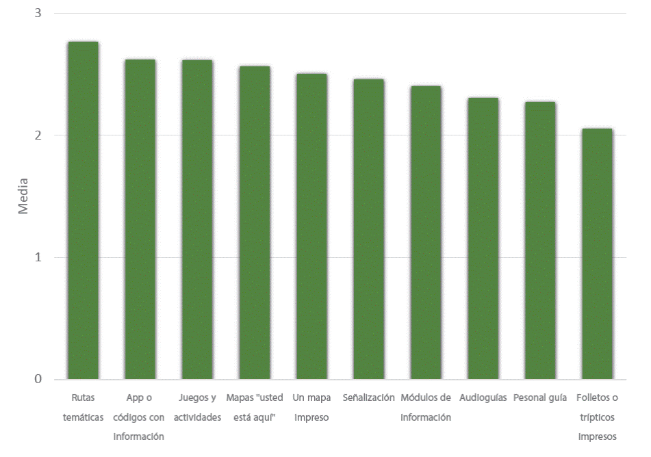 Los visitantes del PEX manifestaron una preferencia por la mayoría de las opciones presentadas en la Figura 4, como estrategias de mediación para conocer mejor el parque. Las rutas temáticas fue la opción con mayor preferencia (x̄ = 2.76, DE =0.533 respecto a una escala 1= nada, 2 = poco y 3 = mucho). Los juegos y actividades, una aplicación de celular o códigos con información sobre el parque, mapas “usted está aquí”, un mapa impreso de todo el parque, más señalización, audioguías y módulos de información, fueron opciones que les gustaría mucho a 50% o más de los visitantes. Una persona que guíe y platique sobre el parque y folletos o trípticos impresos con información fueron las opciones menos preferidas. En el primer caso 53.2% y en el segundo 63.7% mencionó que le gustaría nada o poco.
