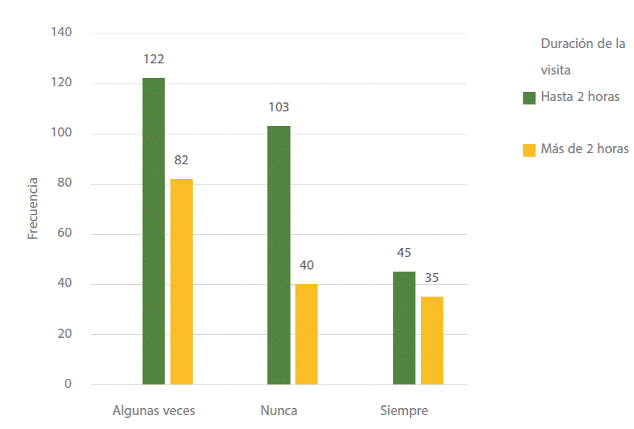En el caso del PEX, como parte del componente funcional de apego, la convivencia familiar y la diversión fue la razón menos mencionada de la visita (11.5%). En su componente cognitivo, sólo 16% reportó haber aprendido nuevas habilidades relacionadas, por ejemplo, con la convivencia familiar y con la naturaleza. Como muestra la Figura 5, al menos 47% de los participantes comentaron haber platicado, con otras personas algunas veces, mientras que 33.5% nunca y 18.7% siempre.