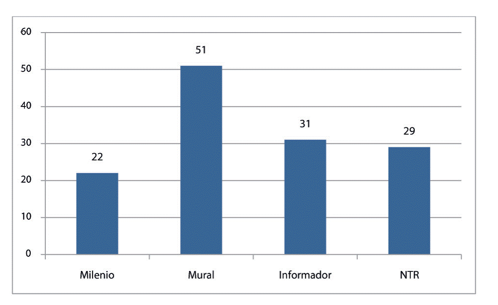 En Mural aparecieron 51 textos (en promedio una nota cada dos días), 31 en El informador, 29 en NTR Guadalajara (cerca de una nota cada cuatro días), y 22 en Milenio Jalisco (casi una nota cada seis días). Por tanto, Mural es el periódico tapatío que más publicó al respecto y Milenio Jalisco, el que menos notas difundió sobre estos temas.
