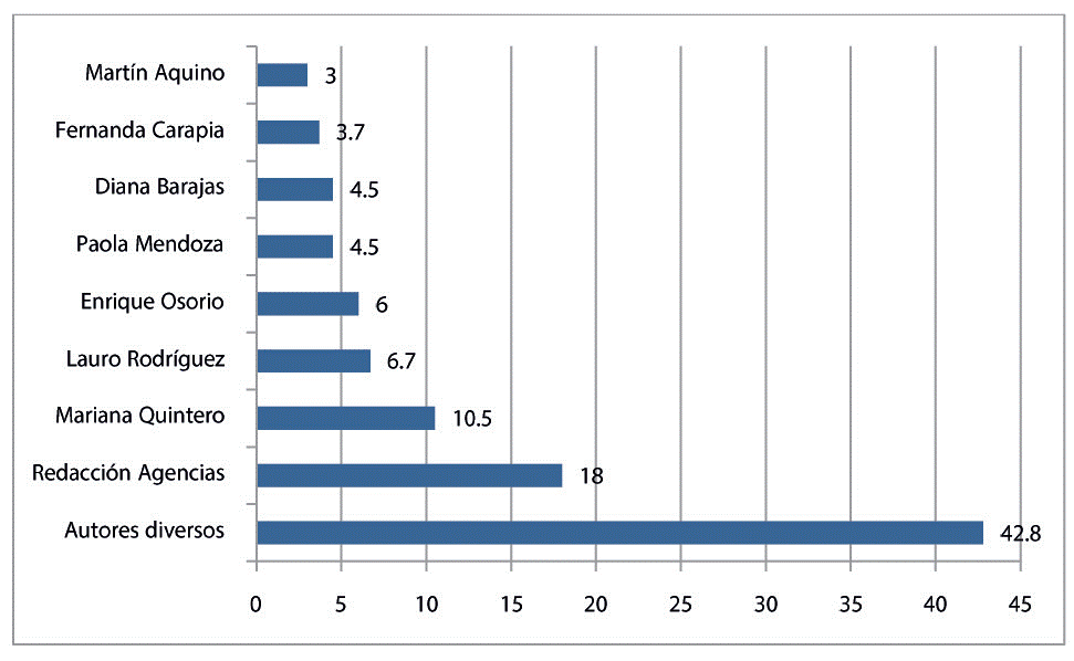 En el caso del periódico Mural, que fue el que más notas publicó, cuenta con cuatro periodistas que escriben sobre temas educativos: Mariana Quintero, Enrique Osorio, Fernanda Carapia y Martin Aquino, por lo que se puede deducir que la situación de contar con varias personas que tratan el tema educativo explica por qué fue el periódico que más notas incluyó (Figura 2).