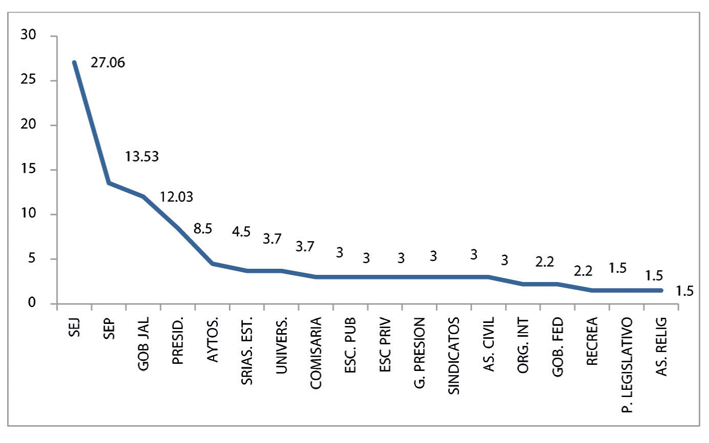 Los actores que desempeñan atribuciones institucionales, como su nombre lo indica, son quienes realizan una función pública o gubernamental específica relacionada directamente con la labor educativa. En este grupo, que son los generadores secundarios de notas informativas, ubicamos a los Ayuntamientos del área metropolitana de Guadalajara, dos secretarías del gobierno del estado de Jalisco, y la Universidad de Guadalajara. Estas instituciones, en conjunto, generaron 11.9% del total de las notas identificadas.