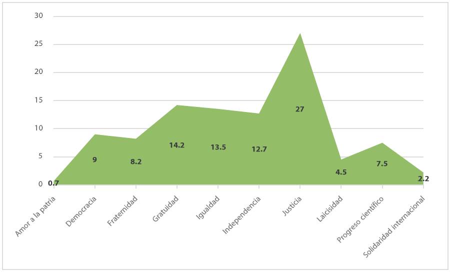Para realizar este análisis se revisó minuciosamente el artículo 3° de la Constitución Política de los Estados Unidos Mexicanos, y se identificaron al menos siete valores educativos constitucionales: amor a la patria, democracia, fraternidad, gratuidad, igualdad, independencia, justicia, laicidad, progreso científico y solidaridad internacional. Los resultados en términos porcentuales de las notas relacionadas con cada valor establecido en la carta magna se muestran en la Figura 4.