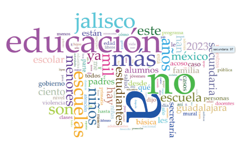 Por último, respecto a los resultados del conteo y agrupamiento de palabras realizado por la aplicación digital https://voyant-tools.org/ que genera gratuitamente nubes de palabras, estadísticas de frecuencia y relaciones entre términos, en la Figura 5 se puede ver que las palabras más mencionadas son aquéllas institucionales: como educación, Jalisco, escuelas, estudiantes, etcétera. En un segundo nivel de mención podemos identificar palabras relacionadas con la familia, por ejemplo: padres, niños, menores, salud, familia, niñas, etcétera. Y un tercer grupo, que también es notorio en la nube de palabras por su frecuencia en las notas, es el vinculado con problemas educativos, como: acoso, casos, atención, violencia, o autoridades.