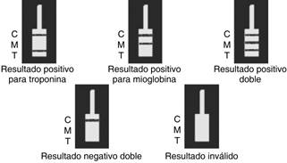Figura 2: Troponina I/mioglobina, resultados de la prueba. C = control. M = mioglobina. T = troponina. Modificada de: Gahp Pharma. Instructivo de troponina I/mioglobina, resultados de la prueba. Disponible en https://gahppharma.com/#demo