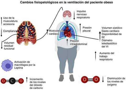 El obeso per se es un paciente que ya tiene complicaciones de tipo metabólico, además de un proceso inflamatorio crónico,8 desarrolla un incremento en el consumo de oxígeno en comparación con una persona no obesa.9 Los volúmenes a nivel intratorácico se reducen debido al incremento del músculo cardiaco, la disminución de la elasticidad torácica por el incremento del panículo adiposo circundante y el aumento de la presión intraabdominal que disminuyen la complianza total en 35%.10