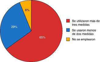 Se utilizaron medidas de protección alveolar en 93.7% (177 pacientes) y no se emplearon en 6.3% (12). Sin embargo, las medidas de protección alveolar de calidad (más de tres medidas) se utilizaron en 65.1% (123 pacientes), se emplearon menos de dos medidas en 28.6% (54) y ninguna en 6.3% (12) (Figura 1).