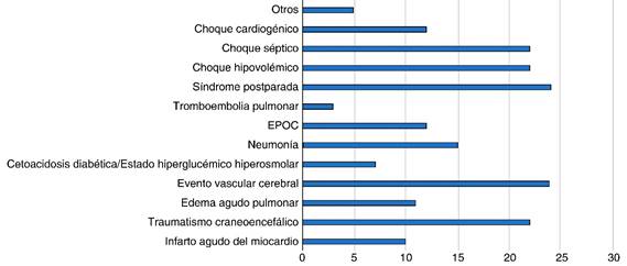 Se investigaron causas de defunción: choque hipovolémico, choque cardiogénico, choque séptico, infarto agudo del miocardio (IAM), EPOC, síndrome de insuficiencia respiratoria aguda (SIRA), neumonía, traumatismo craneoencefálico (TCE).