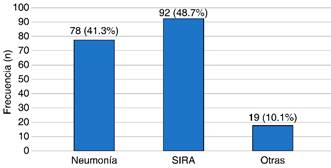 Las complicaciones más frecuentes fueron: SIRA en 48.7% (92 casos), neumonía en 41.3% (78) y otras complicaciones en 10.1% (19) (Figura 3).