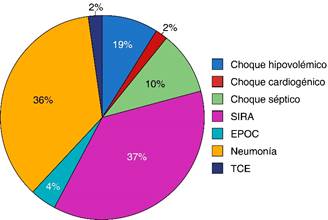 De 2005 a 2007 se realizó un estudio en área de cuidados intensivos de países de Europa; involucró a 150 pacientes que requirieron ventilación mecánica invasiva por diferentes causas (neumonía, sepsis, pancreatitis, enfermedad cardiaca, neurológica, etcétera), las cuales son similares a las detectadas en nuestra investigación, siendo síndrome postparada (22%) y evento vascular cerebral (22%) las más comunes, seguidas de choque hipovolémico (11.6%), choque séptico (11.6%), TCE (11.6%), neumonía (7.9%), EPOC (6.3%), choque cardiogénico (6.3%), edema agudo pulmonar (5.8%), IAM (5.2%), CAD/EHH (3.7%), otros (2.6%) y menos frecuente TEP (1.5%).