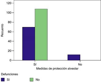 Se analizó la relación que existe entre el uso de medidas de protección alveolar y la defunción, observándose que entre los 177 pacientes en los que se utilizaron dichas medidas se registraron 69 defunciones y 108 vivos; en comparación, los 12 pacientes en quienes no se usaron medidas fallecieron todos (100%) (Figura 6), hubo significancia estadística (p = 0.001).