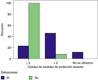 De los 189 pacientes estudiados, en 177 (93.6%) se utilizaron medidas de protección alveolar; de éstos, en 123 (65%) fueron de calidad con más de tres medidas. En 4% (siete casos) no se registraron complicaciones y en 96% (170) sí se presentaron. En 12 (6.3%) no se utilizaron medidas de protección alveolar y, a pesar de ello, todos (100%) presentaron complicaciones. No se encontró diferencia estadística significativa (p = 0.483).