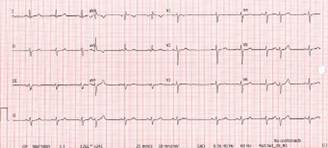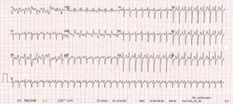 Ingresa al área de urgencias obstétricas por presentar palpitaciones rápidas, con 10 horas de evolución, habiendo realizado maniobras vagales en casa sin éxito. Al interrogatorio refiere palpitaciones rápidas, disnea, ansiedad, niega dolor precordial, lipotimias, síncope, niega dolor obstétrico y también pérdidas transvaginales. A la exploración física: tensión arterial 100/66 mmHg, presión arterial media 82 mmHg, frecuencia cardiaca (FC) 211 latidos por minuto (lpm), frecuencia respiratoria 24 respiraciones por minuto (rpm), saturación de oxígeno de 97%, sin repercusión hemodinámica; se realiza ultrasonido obstétrico el cual resulta normal y ECG de 12 derivaciones (Figura 1).