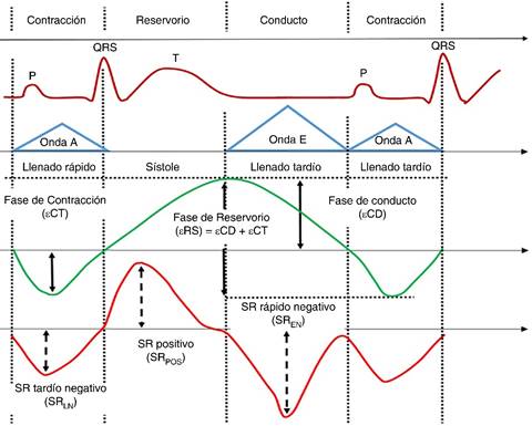 Fase de reservorio: comienza al final de la diástole ventricular (cierre de la válvula mitral) y continúa hasta la apertura de la válvula mitral. En esta fase se produce el llenado de la AI por la sangre procedente del retorno venoso pulmonar, durante la sístole ventricular, manifiesta la contracción isovolumétrica del VI, su eyección, así como la relajación isovolumétrica, la cual depende principalmente de la función sistólica del VI, el tamaño de la aurícula y su compliancia, así como de la función sistólica de la AI, generando una deflexión de deformación positiva en la curva del strain. Esta fase está influenciada por el movimiento del anillo mitral hacia el ápex y por la contractilidad del VI, por lo que el strain reservorio no sólo refleja la capacidad compliante de la AI, sino también la de contractilidad del VI.