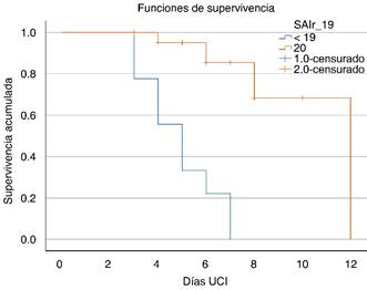 La regresión logística ajustada por variables confusoras se muestra en la Tabla 4. La bondad de ajuste del modelo de regresión logística binaria muestra que el SAIr < 19% está asociado como factor de riesgo de muerte (OR 1.62, IC95% 1.215-2.113), estadísticamente con valor de p = 0.001 y una puntuación estimada de 68%, lo que determina una relación fuerte de la variabilidad en ocurrencia de complicaciones mediante el coeficiente de determinación R2 de Nagelkerke.