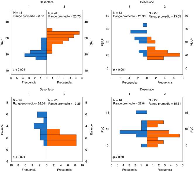 Se determinó tasa de supervivencia mediante una curva de Kaplan-Meier (Figura 2). La tasa de supervivencia fue mayor en los pacientes que presentaron SAIr 20 en comparación con los que presentan un SAIr < 19. En cuanto al análisis de probabilidad de mortalidad, en la Figura 3 se observa que SAIr como desenlace por mortalidad y strain de la AI es significativo con valor de p < 0.001; la presión sistólica de la arteria pulmonar (PSAP) mostró significancia estadística en el desenlace por mortalidad con un valor de p < 0.001; el balance también registró un valor de p = 0.001 con desenlace de mortalidad significativamente estadístico; sólo la presión venosa central (PVC) no mostró significancia estadística en el desenlace por mortalidad (p = 0.69).