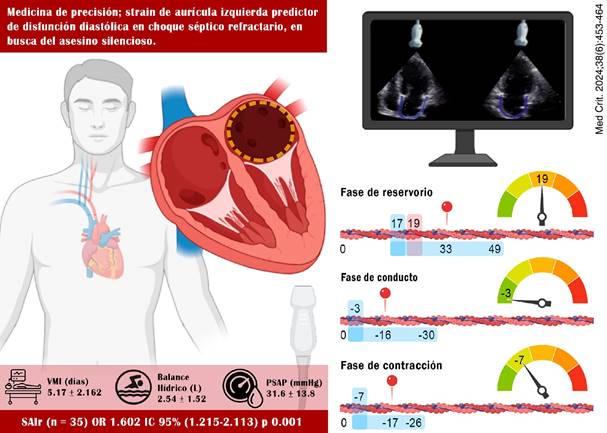 Nuestro estudio tuvo como propósito demostrar que strain de la aurícula izquierda en fase de reservorio (SAIr) puede ser predictor en la mortalidad en pacientes con choque séptico que ingresaron a la unidad de terapia intensiva del Hospital de Alta Especialidad ISSSTE Veracruz. En este trabajo presentamos rangos de referencia ecocardiográficos para SAIr evaluando la función diastólica del VI según las pautas de las diversas sociedades de ecocardiografía, puesto que se considera transcendental identificar con precisión la disfunción miocárdica, de una población normal de 35 pacientes con choque séptico refractario, con un amplio rango de edad y una distribución equilibrada de sexos. Todos los registros fueron adquiridos y supervisados por ecografistas experimentados. Los valores de SAIr fueron menores a mayor edad. Además, las deformaciones específicas se asociaron con varias características del paciente, los rangos de referencia presentados se pueden utilizar para respaldar la toma de decisiones clínicas al evaluar pacientes con choque séptico refractario; las diferencias en la distribución por edades, el tamaño de las muestras estudiadas y el método utilizado para analizar la tensión pueden explicar en parte las diferencias entre los resultados de otras revisiones.