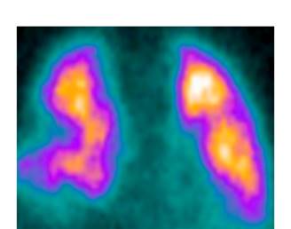 Figura 1: Perfusión pulmonar. Tres defectos segmentarios de distribución vascular en el pulmón derecho y dos defectos segmentarios de distribución vascular en el pulmón izquierdo.