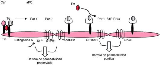 Figura 2: Regulación en la permeabilidad vascular por vía de proteína C (PC ). Sale a la circulación en forma de cimógeno, modificada previamente por la vitamina K. Una vez en la circulación es activada (aPC ) lentamente por la trombina (Tm) y, en presencia de la trombomodulina (Td), esta reacción se cataliza bajo el influjo del calcio. La aPC en presencia de su cofactor no enzimático se une a su receptor endotelial de proteína (EPCR ). Pequeñas cantidades de trombina son captadas por la trombomodulina para convertir el complejo de PC-EPCR a su forma activada. A partir de este momento, este complejo activado estimula el receptor esfingosina cinasa 1 (S1PR1) mediante la estimulación de una esfingosina de fosfato. El complejo S1PR1 está íntimamente relacionado con la barrera de permeabilidad endotelial durante la inflamación, además de la quelación del lipopolisacárido de las enterobacterias, así como la regulación del interferón generado por los macrófagos. Mediante la interacción con el complejo Par 1 (Protein Activated Receptor 1), la trombina y la trombomodulina generan S1PR2,3 el cual condiciona adhesión plaquetaria mediante residuos de aPC, estimulando glicoproteínas ab1 y receptor de la apolipoproteína E2. Adicionalmente, este complejo promueve factor V, factor VIII y vitronectinas. El inhibidor de la activación del plasminógeno tisular también es promovido por este complejo. La pérdida de contención vascular durante la inflamación y los cuadros sépticos están mediados por el complejo S1PR2,3. CCM feb 2010.