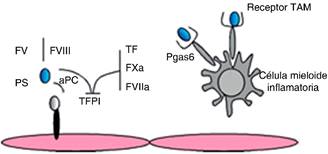 Figura 3: Inmunomodulación y anticoagulación de la proteína S. La proteína S por medio de la vía inhibitoria del factor tisular bloquea el complejo ternario de la coagulación, compuesto por el factor Xa, el factor VIIa y el factor tisular. Desde el punto de vista de inmunomodulación, la proteína S interactúa con células mieloides inflamatorias mediante señales intracelulares, estimulando receptores tirosina cinasa Mer con lo cual promueve la fagocitosis del macrófago de los cuerpos apoptóticos y de los fosfolípidos de membrana. La proteína S, a partir de señales transgénicas, regula el factor de transcripción nuclear, los sistemas TLR (Tool Like Receptor) y la molécula Myd88, modulando la respuesta primaria inmunitaria humoral y celular. CCM feb 2010.