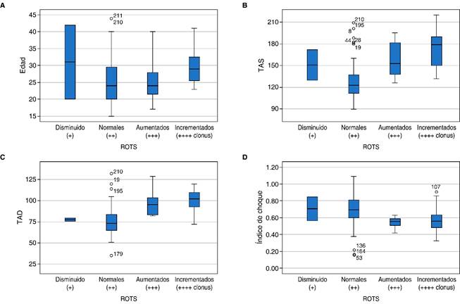 Se observó un RIQ por edad de 25.5 a 32.5 años en caso de ROTSP ++++ y de 21.5 a 28 años en el caso de ROTSP +++, así como su asociación a presiones arteriales elevadas (TAS 137.5-181.5 mmHg en reflejos aumentados y de 150-190 mmHg en reflejos incrementados; en tensión arterial diastólica (TAD) de 83-104 mmHg y de 92.5-110 mmHg en reflejos aumentados e incrementados respectivamente), de igual manera se vio un índice de choque 0.5 a 0.58 en hiperreflexia aumentada y de 0.48 a 0.63 en hiperreflexia incrementada (Figura 2). Se observó una r = 0.486 (p < 0.001) entre los ROTSP y la tensión arterial sistólica (TAS) lo que indica una relación positiva moderada entre ambas variables.