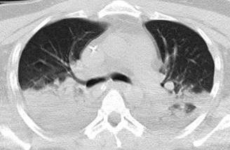 Durante su estancia en la UCI se inicia protocolo de estudio ante deterioro neurológico súbito y fiebre, se realiza punción lumbar con líquido cefalorraquídeo normal, tomografía de cráneo simple a su ingreso y a las 72 horas en las cuales se descarta evento cerebrovascular. PAR y PCR COVID negativos, cultivo de secreción bronquial, urocultivo, hemocultivo central y periférico negativos. La tomografía de tórax (Figura 1) muestra neumonía lobar bilateral, por lo que se inicia manejo antimicrobiano para patógenos atípicos ante paciente inmunosuprimido. Panel de neumonía por método RT-PCR FilmArray de secreción bronquial negativo, así como PCR GeneXpert para Mycobacterium tuberculosis negativo. Anticuerpos anti-Coccidioides immitis IgG e IgM positivos, concordante con cuadro clínico.