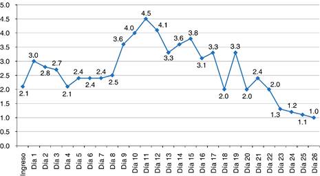 Se realizó ultrasonido renal, el cual reportó un índice de resistencia de 0.9, ante éste y la necesidad de terapia de reemplazo renal, así como el tiempo de evolución del injerto, se sospechó el rechazo del mismo, llamando la atención la evolución hacia la recuperación (Figura 2) de la función renal posterior al control del estado séptico sin modificación significativa del índice de resistencia posterior a la resolución de lesión renal aguda (Figura 3). Se mantuvo en manejo con esteroide, sin nuevo requerimiento dialítico.
