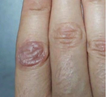 Paciente masculino de 31 años, sin antecedentes médicos de interés ni consumo de medicamentos en la actualidad, que acudió a consulta por haber manifestado, en dos ocasiones luego de 3-4 horas de consumir ginebra con agua tónica “Schweppes®”, una lesión eccematosa en el labio, con formación de úlceras en la cavidad bucal (Figura 1) y una lesión eritematosa fija en la segunda falange de la mano derecha (Figura 2) luego de 24 horas. Las manifestaciones clínicas fueron desapareciendo de forma espontánea; sin embargo, persistió la hiperpigmentación en las zonas durante 2-3 semanas. El paciente refirió haber sufrido, en alguna ocasión, un cuadro con similares características que lo relacionó con el consumo de agua tónica sin ginebra. No refirió la aparición de lesiones con el consumo concomitante de otros alimentos, fármacos ni cofactores adicionales (estrés o consumo de antiinflamatorios).