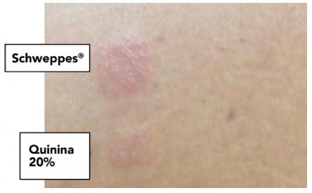 Se efectuaron estudios alergológicos en el paciente de este caso y en 10 controles sanos. Se llevaron a cabo pruebas cutáneas con aeroalérgenos y alimentos de referencia, que resultaron negativas. Posteriormente se practicaron pruebas cutáneas con cloroquina y agua tónica “Schweppes” al 1/10, también con resultado negativo. Luego de 8 semanas de la reacción adversa se efectuaron pruebas epicutáneas con agua tónica “Schweppes®”, ginebra y quinina al 20% en vaselina, tanto en el área afectada como en las zonas de piel sana, con resultado positivo (++) para ambos productos empleados. Figura 3