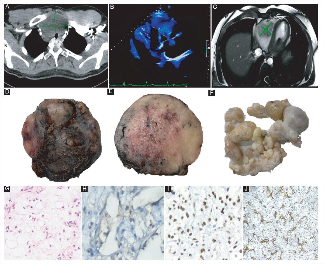 Figura 1 Diagnóstico de liposarcoma mixoide cervical con extensión mediastinal e implante en el ventrículo derecho en paciente joven. A: tomografía en corte axial con medio de contraste oral y endovenoso donde se evidencia lesión de 93.8 × 45.7 mm (líneas verdes) localizada en espacio visceral entre la glándula tiroides y la tráquea. B: ecocardiograma transtorácico donde se observa una masa que compromete la válvula tricúspidea. C: resonancia magnética cardiaca en donde se muestra dilatación de ventrículo derecho secundario a lesión tumoral de 46 × 39.5 mm que invade tejido cardiaco (líneas verdes). D y E: tumor de mediastino de 9.5 × 7.5 × 5.5 cm y 222 g, de superficie lisa y de color café violáceo. F: tumor ventricular compuesto por varios fragmentos de tejido que miden en conjunto 12 × 8.5 × 3 cm y pesan 78 g, son irregulares y de color café claro. G: neoplasia mesenquimatosa maligna tanto de mediastino como ventricular compuesta por células elongadas, ovoides, con lipoblastos que tienen una a dos vacuolas citoplasmáticas, dispuestos en un fondo mixoide (H y E, 200x). H-J: por inmunohistoquímica las células neoplásicas son positivas de manera focal a la proteína S-100 (G, 400x, inmunohistoquímica) y de manera difusa a DDIT3 (H, 400x, inmunohistoquímica). El CD34 resalta la red vascular (I, 100x, inmunohistoquímica).