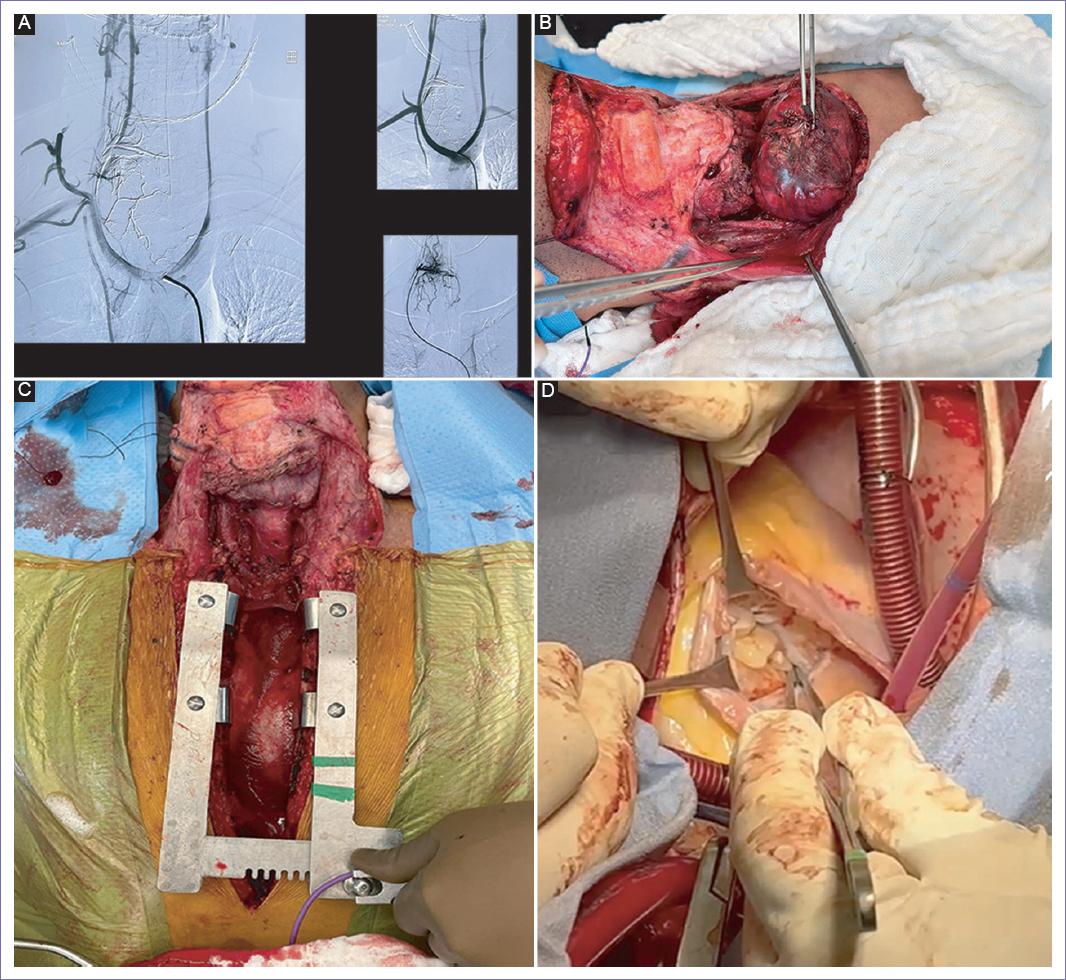 Para la embolización del tumor (Fig. 2A), se realizó una angiografía de troncos supraaórticos, evidenciando un tumor gigante de cuello hipervascularizado nutrido por las ramas de la arteria tiroidea inferior derecha. Se retiró el catéter diagnóstico y se procedió a navegar catéter guía hasta el interior de arteria tiroidea inferior derecha. Se retiró la guía y se buscó alcanzar pedículo que irrigaba la mitad izquierda del tumor hipervascularizado para embolizar la mitad izquierda de tumor gigante hipervascularizado de cuello. Luego se buscó llegar al segundo pedículo que irrigaba la mitad derecha del tumor hipervascularizado para también embolizarlo. Se realizaron controles angiográficos que demostraron embolización total del tumor, sin alteración de circulaciones cerebrales anteriores. Dos días después se realizó la resección de tumor en la base del cuello con extensión a mediastino bajo. Se hizo incisión de esternotomía media y se reseccionó completamente el tumor (Fig. 2B), mediante un abordaje combinado cervical y mediastínico, con preservación de nervios laríngeos recurrentes y vago bilateral apoyados en neuromonitorización, así como la preservación de estructuras vasculares como arterias carótidas derecha e izquierda, venas yugulares internas derecha e izquierda, tronco braquiocefálico y vena innominada, con sacrificio de yugular externa derecha (Fig. 2C). Después de la resección del tumor, en un segundo tiempo, se llevó a cabo una destumorización en el ventrículo derecho, se incidió a pericardio longitudinalmente, se colocaron jaretas, se administró heparina, se canuló la aorta y ambas venas cavas, se procedió a derivación cardiopulmonar, se obtuvo hipotermia a 32 °C, se pinzó la aorta, se cincharon las venas cavas y se incidió en la aurícula derecha. Se realizó una incisión de 0.5 cm en la fosa oval introduciendo una cánula de vent. Posteriormente, se hizo una disección roma y cortante de la tumoración multilobulada en ventrículo derecho, de manera paliativa (Fig. 2D). Preservado el aparato subvalvular tricúspide, se revisó que no hubiera un tumor macroscópico residual. Se verificó la integridad de la válvula tricúspidea, se efectuó una prueba hidráulica sin observarse insuficiencia y se retiró la cánula. Se realizó sutura de incisión en fosa oval y se purgó mediante maniobra de Valsalva; luego se suturó incisión de aurícula derecha, se recuperó normotermia, se despinzó la aorta y se purgó por raíz de aorta. Se observó fibrilación ventricular y se colocó un electrodo de marcapaso epicárdico temporal en el ventrículo derecho. Se destetó de la derivación cardiopulmonar y se retiró cánula, administrándose protamina, verificando hemostasia, colocándose sondas mediastinales 36 Fr por contrabertura, suturando y finalizando el procedimiento quirúrgico. El paciente se encontró estable tanto cardiológica como metabólicamente con adecuada entrada y salida de aire, sin presencia de estertores o sibilancias, ni evidencia de infiltrados y sin datos de síndrome de respuesta inflamatoria sistémica. Evolucionó en el postoperatorio de forma satisfactoria. Se le retiran drenajes mediastinales y cervical sin complicaciones. Ingresó a terapia intermedia sin requerimiento de terapia de soporte, por lo que se decidió su egreso.