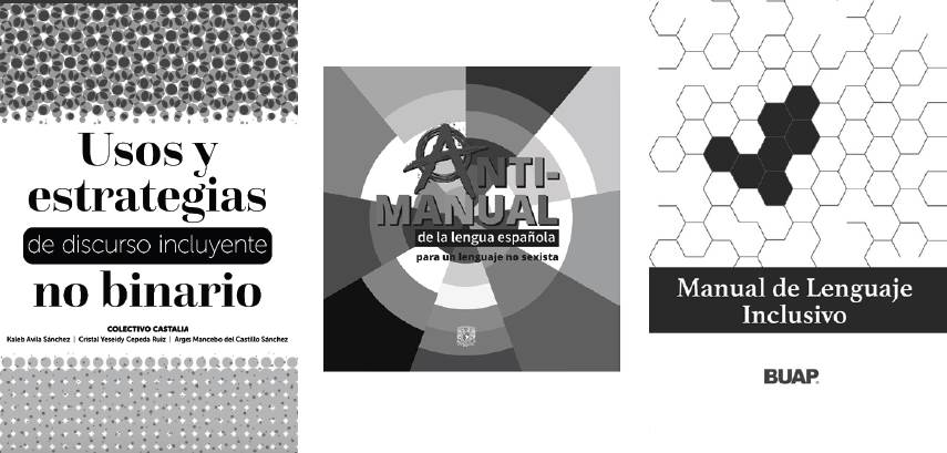 Entre la amplia oferta de recomendaciones sobre un lenguaje no sexista, mi orientación para el presente texto se centra en tres manuales mexicanos publicados entre 2022 y 2023. Dos de estos tienen un enfoque más o menos académico: el Antimanual de la lengua española. Para un lenguaje no sexista, de la Universidad Nacional Autónoma de México (unam) y el Manual de lenguaje inclusivo, de la Benemérita Universidad Autónoma de Puebla (buap). Fuera del ámbito institucional está el documento titulado Usos y estrategias del lenguaje incluyente no binario, editado por el colectivo Castalia.