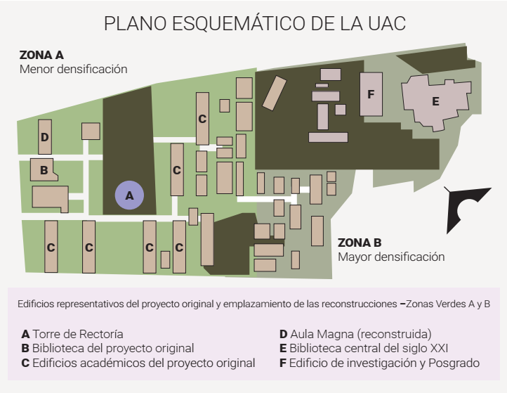 En función del medio construido en la Zona A, dentro de lo destacable y positivo, puede afirmarse que parte de la unidad de su estilo arquitectónico se preserva, y una buena intervención general y respetuosa de la misma podría enriquecer y mantener vivo este patrimonio construido del siglo XX. Así mismo, otro elemento positivo relevante es una pervivencia de aproximadamente casi la mitad del territorio que eran áreas verdes del proyecto original del Campus Uno, el cual se encuentra en buenas condiciones para favorecer un microclima de confort en las áreas exteriores de la UACAM.