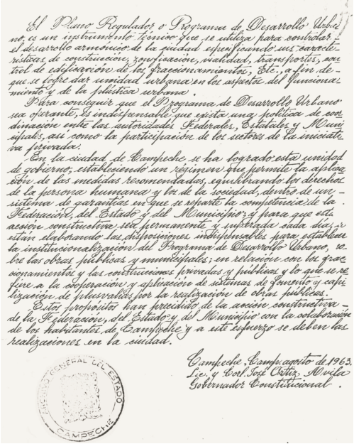Las directrices de las políticas públicas de Trueba Urbina, en función de sus criterios urbanísticos y arquitectónicos, eran lograr una ciudad contrastante, manteniendo sus raíces coloniales en un extremo y retadoramente nueva mirando hacia el futuro. Durante el discurso de Trueba Urbina, con fecha 7 de agosto de 1957, en el cual se celebraba el centenario de la constitución de Campeche como estado, destaca al “Campeche Nuevo” como una obra vigorosa que significaba la construcción de una nueva ciudad, digna y de las mejores.4