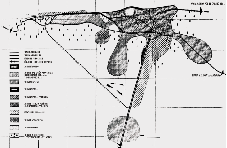 En el Plan de Desarrollo Urbano, que se empezó a elaborar desde 1961 la llegada a la gubernatura de José Ortiz Ávila (1961-1967), quedó plasmada la tesis urbanística10 en la que destacan las intervenciones escultóricas11 en el espacio público. El plan se fundamentaba en un ideario político y heredó las bases del Plano Regulador de Domingo García Ramos con su esquema de zonificación e innovadora vialidad bajo el sistema de circulación del Arq. Hermann Herrey. Para elaborar el Programa de Desarrollo Urbano se contemplaron los factores que se clasificaron en: a) nacionales, b) regionales, c) zonales, d) económicos, e) de producción, f) político-administrativos, g) humanos y h) físico-geográficos. Con la interacción de estos elementos se propuso una zonificación de la ciudad en el proyecto urbano de Álvarez Ordóñez.