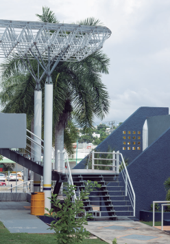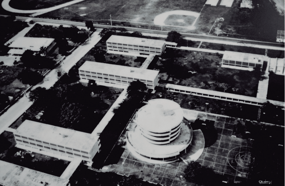La esencia arquitectónica del conjunto de edificios que albergan las diferentes escuelas era de corte funcionalista, con algunas reinterpretaciones adecuadas para poder generar en todo el complejo un microclima que fuera agradable para el desarrollo de las actividades de una universidad que no utilizaba climatización artificial en los años sesenta. El diseño de los inmuebles contemplaba ventilación cruzada y celosías que permitían el paso libre del aire y controlaban el ingreso de la luz solar, como principios de la arquitectura internacional de Le Corbusier.17 Y, como una respuesta de diseño ambiental, en los extremos de los edificios había zonas cubiertas en su planta baja que eran soportadas por cuatro columnas o más, las cuales articulaban la circulación horizontal y protegían del sol y de la lluvia.