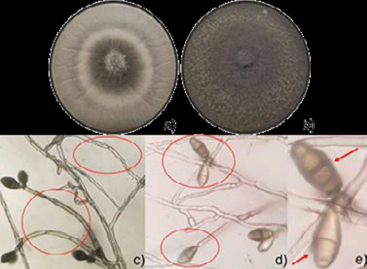 El hongo en PDA formó micelios lanosos con un color inicial de blanco a café oscuro, mientras que, a partir de los 8 dde continúa cambiando de grisáceo a color pardo oliváceo o negro. En su micromorfología los micelios presentan hifas septadas de color pardo, con conidióforos simples o ramificados y curvados, el tamaño de los conidios es de 8-14 × 21-35 µm (Figura 1). La identificación molecular de la cepa concordó con Curvularia eragrostidis (Hennings) (J.A. Meyer) con una similitud del 99.8 % con los números de registro: MH938080.1 y LT715562.1 en la base de datos GenBank (Maldonado-Michel et al. 2021), las secuencias de la cepa de estudio se depositaron en el GenBank con número de acceso MZ510930.