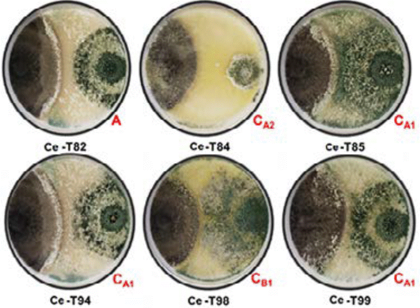 Figura 2 Tipos de interacciones entre C. eragrostidis (Ce) y cepas de Trichoderma spp. Ce-T82) A= inhibición al contacto. Ce-T84) CA2= reemplazo completo después de una inhibición al contacto. Ce-T85) CA1= reemplazo parcial después de una inhibición al contacto. Ce-T94) CA1= reemplazo parcial después de una inhibición al contacto. Ce-T98) CB1= reemplazo parcial después de una inhibición a distancia. Ce-T99) CA1= reemplazo parcial después de una inhibición al contacto.