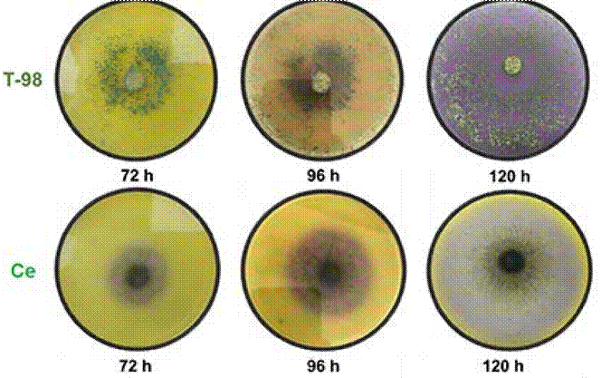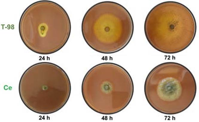 Ensayo cualitativo de quitinasa. En la medición cualitativa de la actividad de quitinasa producida por las cepas T-98 y C. eragrostidis, se observó la formación de halos de color púrpura, lo cual es indicativo positivo de actividad de quitinasa en ambas cepas. La cepa de Trichoderma sp. T-98, no mostró ninguna presencia de halos color púrpura hastas las 72 h, mientras que a las 96 h sí se observó la coloracion púrpura en la caja Petri, y a las 120 h toda la caja Petri presentó coloracion púrpura. Por su parte, C. eragrostidis presentó en todo momento la formacion de los halos púrpuras conforme se desarrolló en el medio (Figura 3).