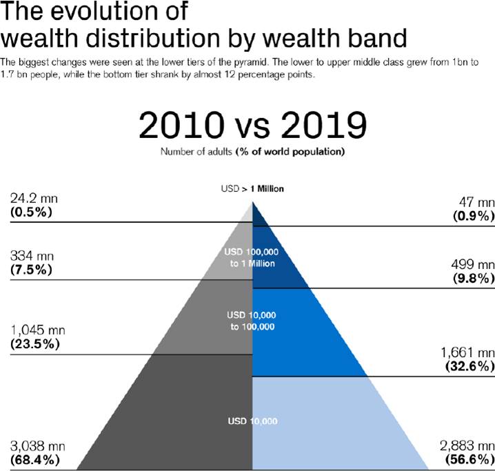 En efecto, la Figura muestra la evolución de la distribución de la riqueza por banda de 2010 a 2019 y permite observar que si bien el porcentaje de adultos cuya riqueza es de hasta 10,000 dólares sigue siendo muy elevado, dicho porcentaje se redujo del 68.4% al 56.6% en ese periodo. Es decir, casi el 12% del total de adultos en el mundo salió del sector más bajo de la pirámide y fue este sector el único que disminuyó en porcentaje respecto al periodo inicial.