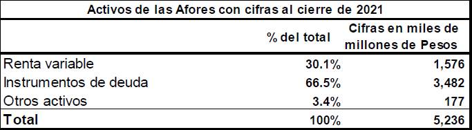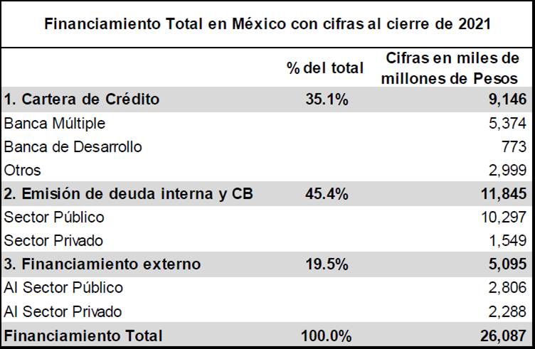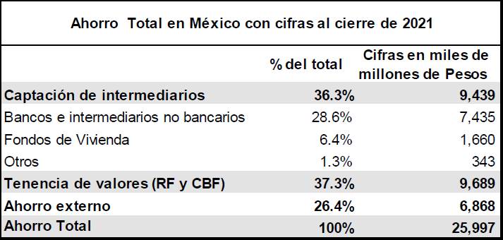 Fuente: elaboración propia con datos de: CNBV Ahorro financiero y financiamiento en México diciembre 2021 disponible en: https://www.gob.mx/cnbv/es/articulos/reporte-de-ahorro-financiero-y-financiamiento-a-diciembre-de-2021?idiom=es Las sumatorias pueden reflejar un redondeo de cifras.