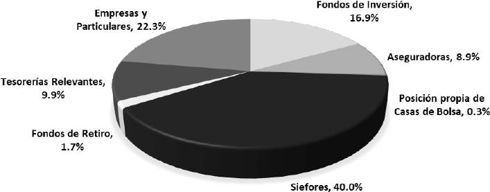 Como puede observarse, los principales inversionistas en el mercado de deuda en México no son los grandes capitales privados quienes si bien tienen una participación relevante apenas rebasan el 30% sino que se trata de vehículos de inversión colectiva (siefores y fondos de inversión) quienes administran los recursos de pequeños ahorradores que adquieren ya sea las acciones de los fondos de inversión o realizan sus aportaciones a las cuentas de retiro.