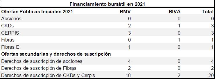 No obstante, los posibles beneficios que el mercado de valores representa como fuente de financiamiento para las empresas, su uso en México es ciertamente limitado.30 De esta manera, en la Figura 7, se observa que, durante 2021, el número de ofertas primarias es diminuto y si bien el número de ofertas secundarias y derechos de suscripción es un poco mayor sigue siendo, en agregado, muy pequeño como se observa en el siguiente cuadro.