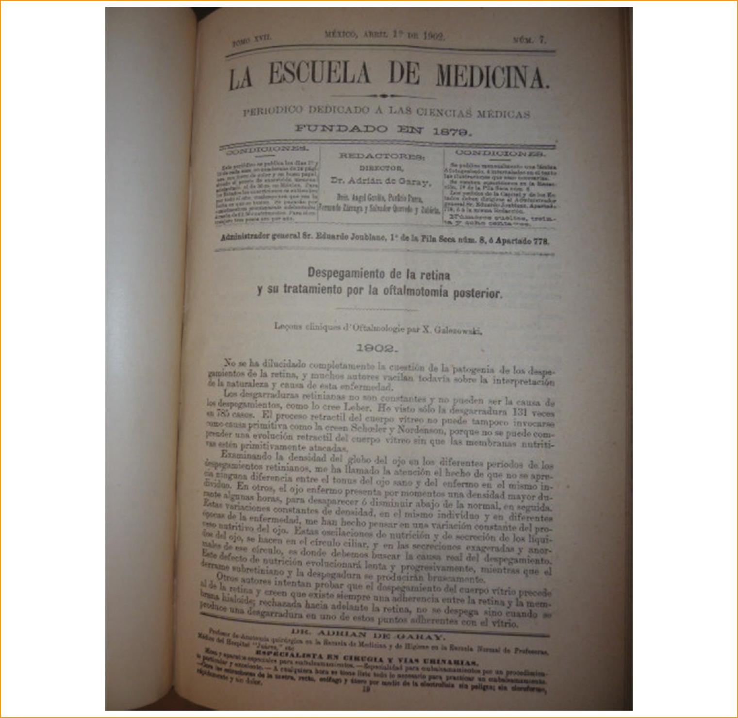 Los trabajos de Xavier Galezowski tuvieron gran difusión en el medio mexicano en las revistas y periódicos de la especialidad, como Gaceta Médica de México y La Escuela de Medicina (Fig. 4), entre otras, así como en The Lancet. Además, fue nombrado miembro correspondiente de la Academia Nacional de Medicina de México con fecha 15 de noviembre de 1889 y miembro honorario de la misma el 9 de mayo de 1901.