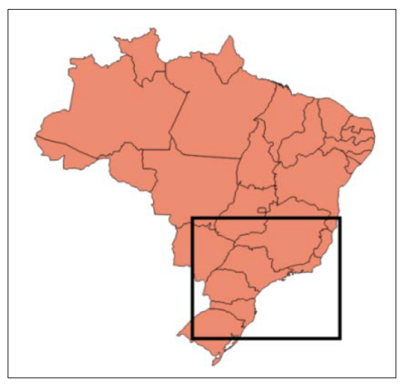 Os dados da RAAP utilizados nos experimentos foram adaptados de (Beserra, 1952). Tratam-se dos dados do nivelamento geométrico de precisão do território brasileiro que tinha sido realizado até então, configurando 105 linhas de nivelamento (observações), com um comprimento total de 15.706,25 km, passando por diversos estados do território brasileiro. O retângulo envolvente correspondente a este nivelamento é apresentado na Figura 4. Um arquivo nomeado “Rede_real_geometria.pdf” e um nomeado “Rede_real_observacoes.pdf”, nos quais a geometria, e os comprimentos e desníveis das observações dessa rede podem ser vistos com maior detalhamento, foram disponibilizados em (Suraci, 2019).